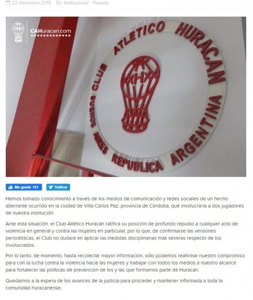 Ante esta situación, el Club Atlético Huracán ratifica su posición de profundo repudio a cualquier acto de violencia en general y contra las mujeres en particular, por lo que, de confirmarse las versiones periodísticas, el Club no dudará en aplicar las medidas disciplinarias más severas respecto de los involucrados”. Expresa el comunicado.