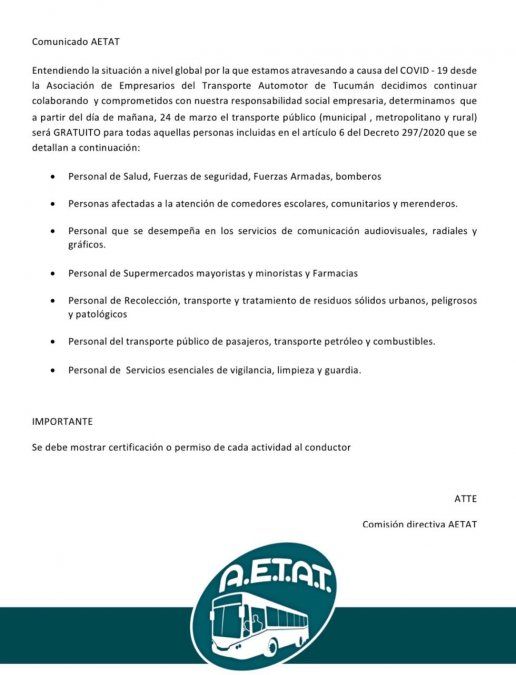 Entendiendo la situación a nivel global por la que atraviesa la provincia a causa del COVID – 19 y en el marco de la cuarentena, desde AETAT (Asociación de Empresarios del Transporte Automotor de Tucumán) decidieron que a partir del día de mañana, 24 de marzo el transporte público (municipal , metropolitano y rural) será gratuito para todas aquellas personas incluidas en el artículo 6 del Decreto 297/2020 que se detallan a continuación: