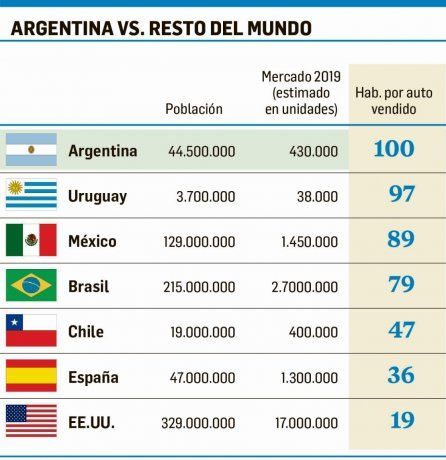 Con estos números, la Argentina queda muy debajo de los niveles de consumos de países de la región y, ni que hablar, de lo que sucede en Europa o Estados Unidos. Sin duda, hay otros mercados con peores resultados pero se tomaron estos ejemplos como países representativos. Con el volumen de ventas que se estima alcanzar en diciembre y una población que ronda los 44.500.000 habitantes, en el 2019 sólo uno de cada 100 personas, en el país, puede acceder a un 0 km. Si se toma de referencia a otros países, el contraste es significativo. Incluso, en una comparación con datos propios. El año pasado se vendía un 0 km cada 55 habitantes.