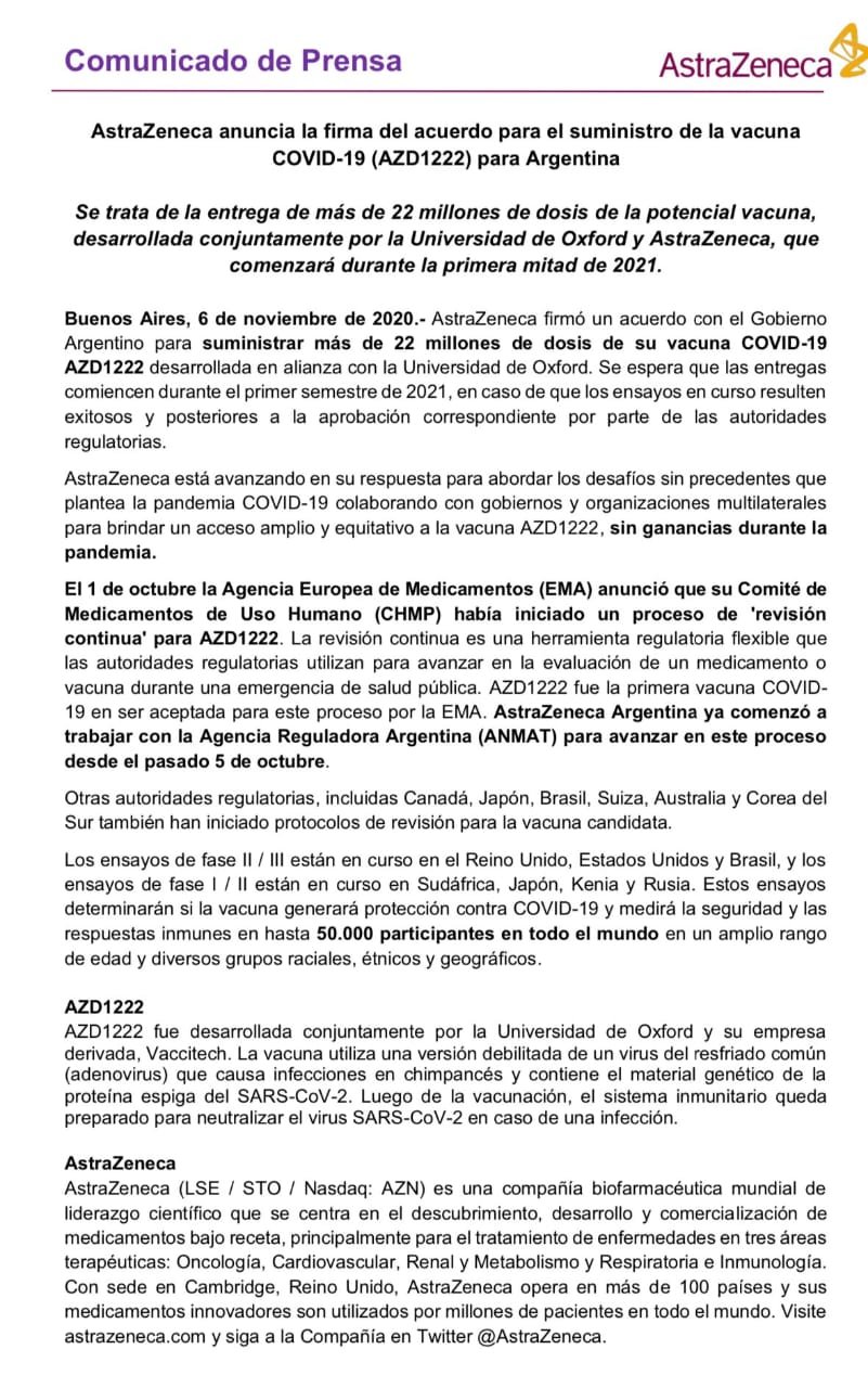 Recordemos que, en agosto, el presidente Alberto Fernández había anunciado que esta vacuna se va a producir en nuestro país: “Es una gran alegría, en Argentina AstraZeneca eligió al laboratorio mAbxience que será el productor del reactivo de la vacuna. Es un reconocimiento a la calidad de los laboratorios argentinos. México será el encargado de envasar la vacuna y completar el proceso de producción”.
