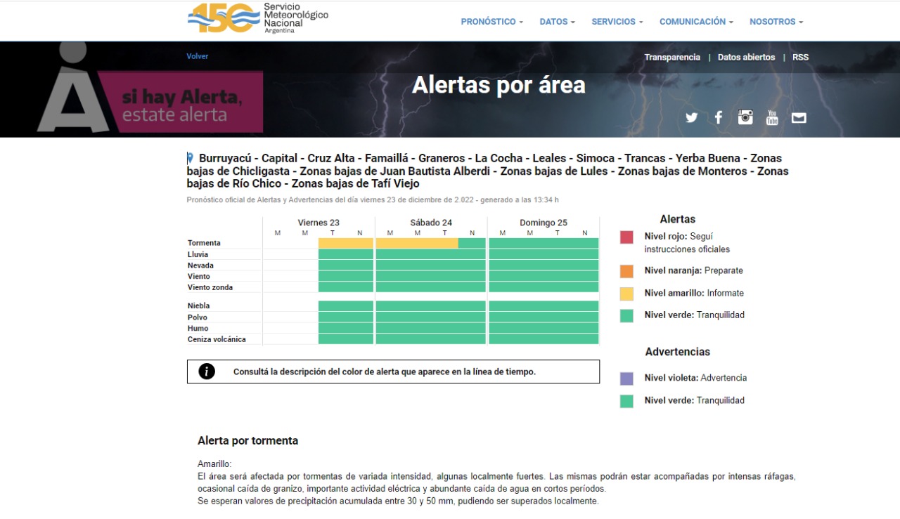 | Zonas en alertaBurruyacú – Capital – Cruz Alta – Famaillá – Graneros – La Cocha – Leales – Simoca – Trancas – Yerba Buena – Zonas bajas de Chicligasta – Zonas bajas de Juan Bautista Alberdi – Zonas bajas de Lules – Zonas bajas de Monteros – Zonas bajas de Río Chico – Zonas bajas de Tafí Viejo |