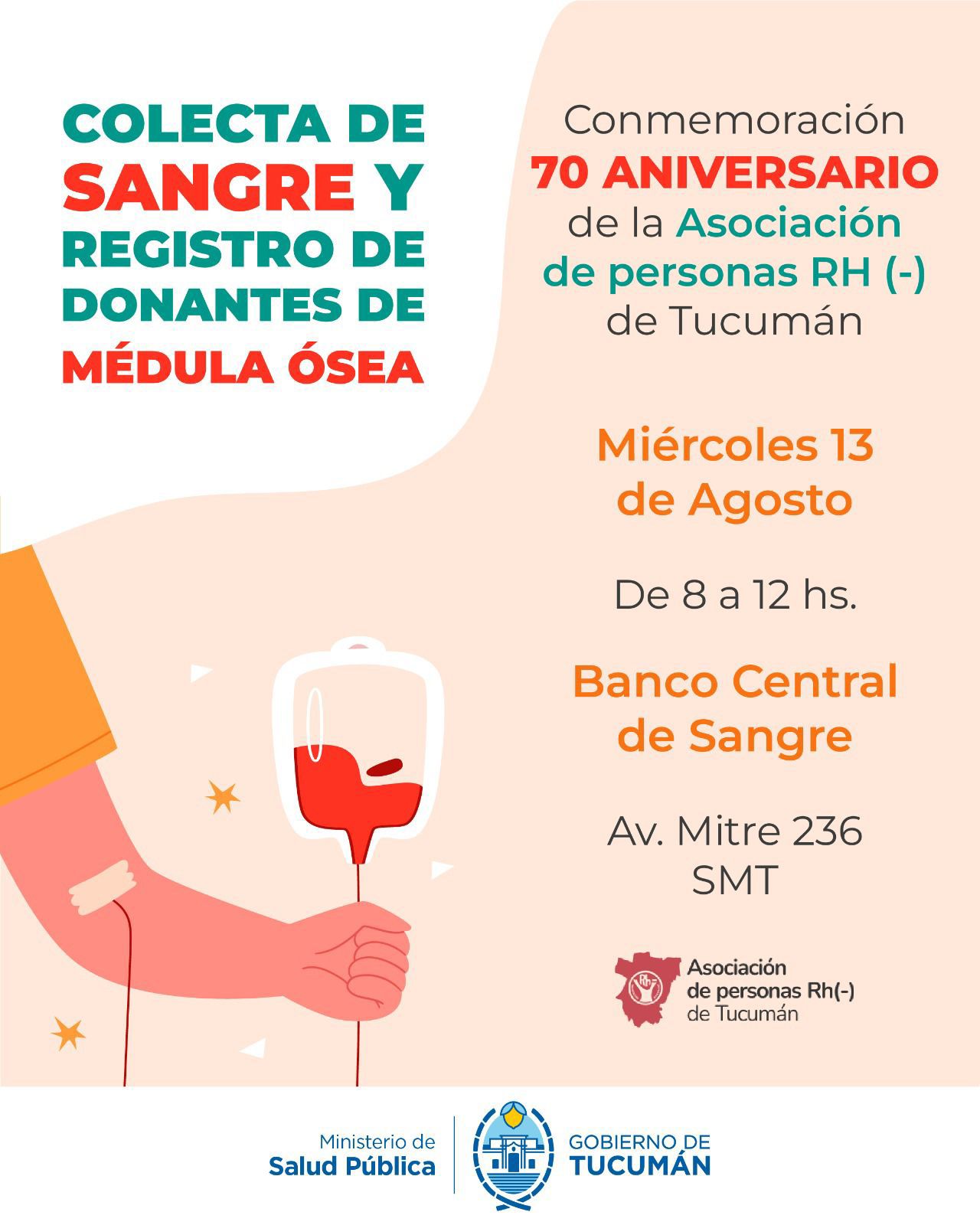 Este miércoles 13 de agosto, en el día de su 70° aniversario, la Asociación de Personas Rh Negativo – Tucumán invita a la comunidad a participar de una colecta de sangre voluntaria en el Banco Central de Sangre de Tucumán, ubicado en Avenida Mitre 236.