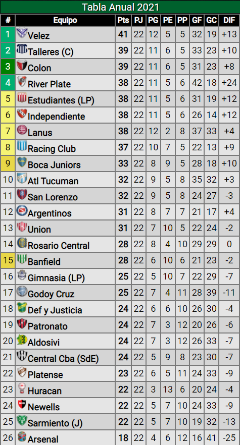 *Al Colón ocupar el tercer puesto de la tabla anual y estar clasificado por la obtención de la Copa de la Liga, quienes accederían a la próxima Libertadores son el primero, el segundo y el cuarto.