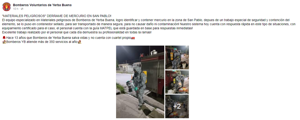 El equipo especializado en Materiales peligrosos de Bomberos de Yerba Buena, logró identificar y contener mercurio en la zona de San Pablo, después de un trabajo especial de seguridad y contención del elemento, se lo puso en un contenedor sellado, para ser transportado de manera segura, para no causar daño ni contaminación.