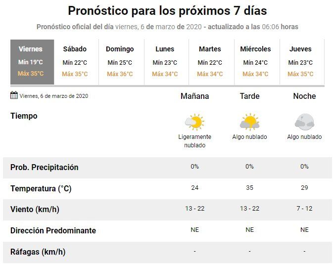 La mínima del primer día del finde aumentará a 22, se mantendrá la más alta, mientras que el séptimo día mantendrá una amplitud entre 25 y 36 grados. Los vientos predominantes provendrán durante estos días desde el noreste y una humedad rondante al 88%.