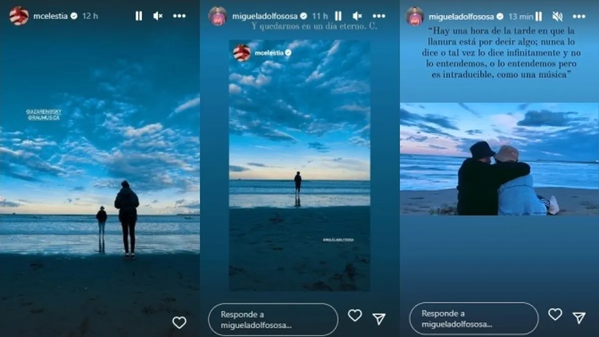 Si bien no es la primera escapada al mar que hacen juntos, sí es el viaje que marca la oficialización del romance de Celeste Cid con Abril Sosa -Miguel Adolfo es su nombre verdadero-. Desde Mar del Plata, la actriz escribió “En una peli” para compartir una postal desde La Feliz junto al baterista de Catupecu Machu de espaldas a cámara, de cara al mar.