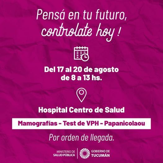 El Ministerio de Salud de Tucumán, dio a conocer que desde la próxima semana se realizarán estudios para mujeres, como mamografías, test de VPH y papanicolau en el Hospital Centro de Salud.