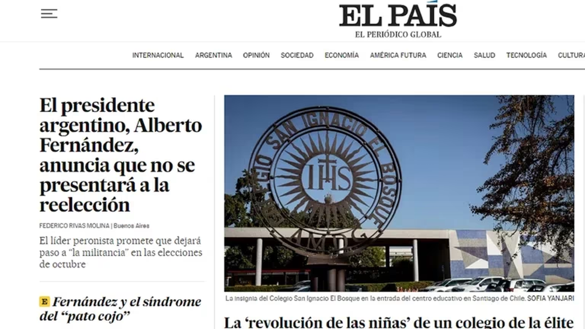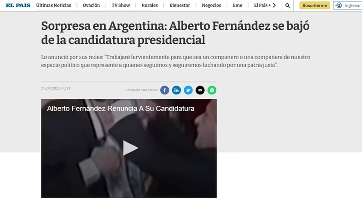 En tanto, el diario El País de Uruguay tituló: “Sorpresa en Argentina: Alberto Fernández se bajó de la Candidatura Presidencial”. En la nota destacaron que el anuncio fue “inesperado” pero que el kirchnerismo le “demandaba desde hace tiempo” que se corriera de la disputa electoral “para que Cristina Kirchner pudiera definir la estrategia electoral”.