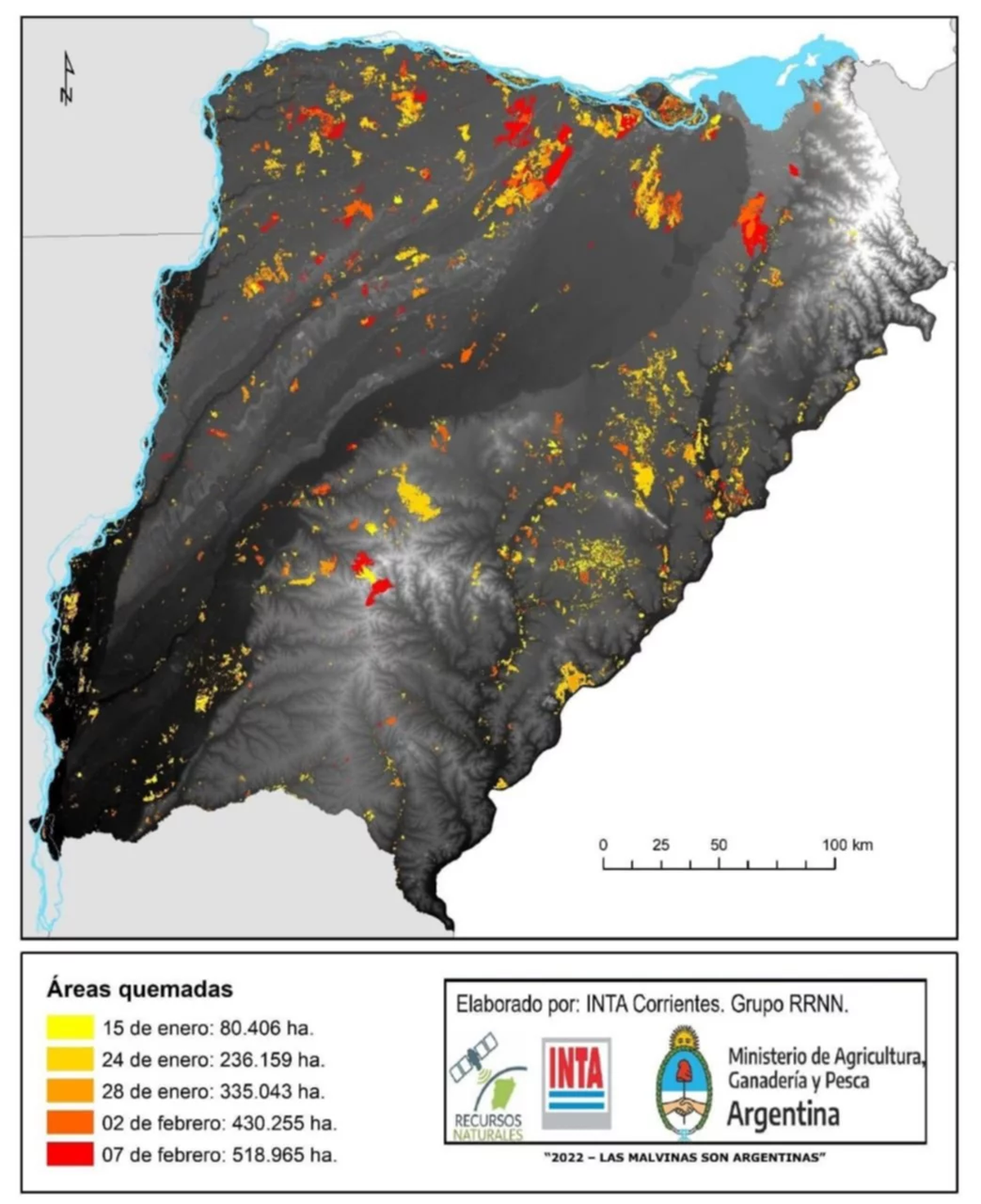 Desde mediados de enero de 2022, el área se incrementó más de 6 veces, pasando de unas 80 mil hectáreas a casi 519 mil al 7 de febrero de 2022, señaló el INTA.