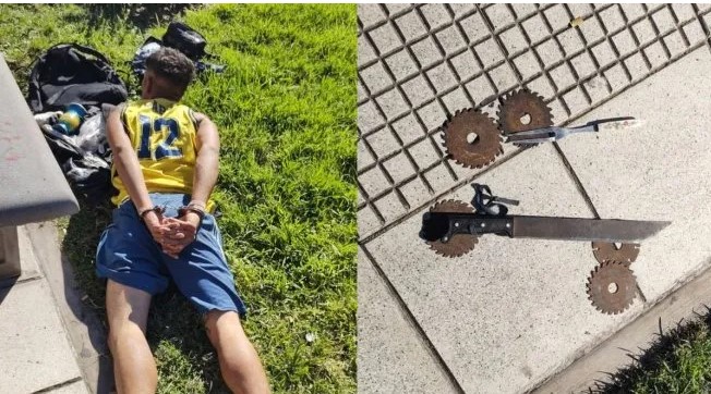 El agresor, identificado como V.M.V., vestía una musculosa del club Boca Juniors y mostraba signos de aparente desequilibrio mental, según informaron fuentes policiales a Infobae. Además del machete, se encontraron cinco discos de amoladora en su poder.
