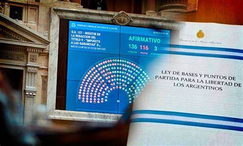 La ley Bases fue aprobada con 147 votos a favor, 104 en contra y 2 abstenciones, manteniendo el texto del Senado que redujo la lista de empresas privatizables y realizó otras reformas significativas. Además, se sancionó la ley de Medidas Fiscales Paliativas y Relevantes que incluye el impuesto a las Ganancias, Bienes Personales y el blanqueo de capitales.