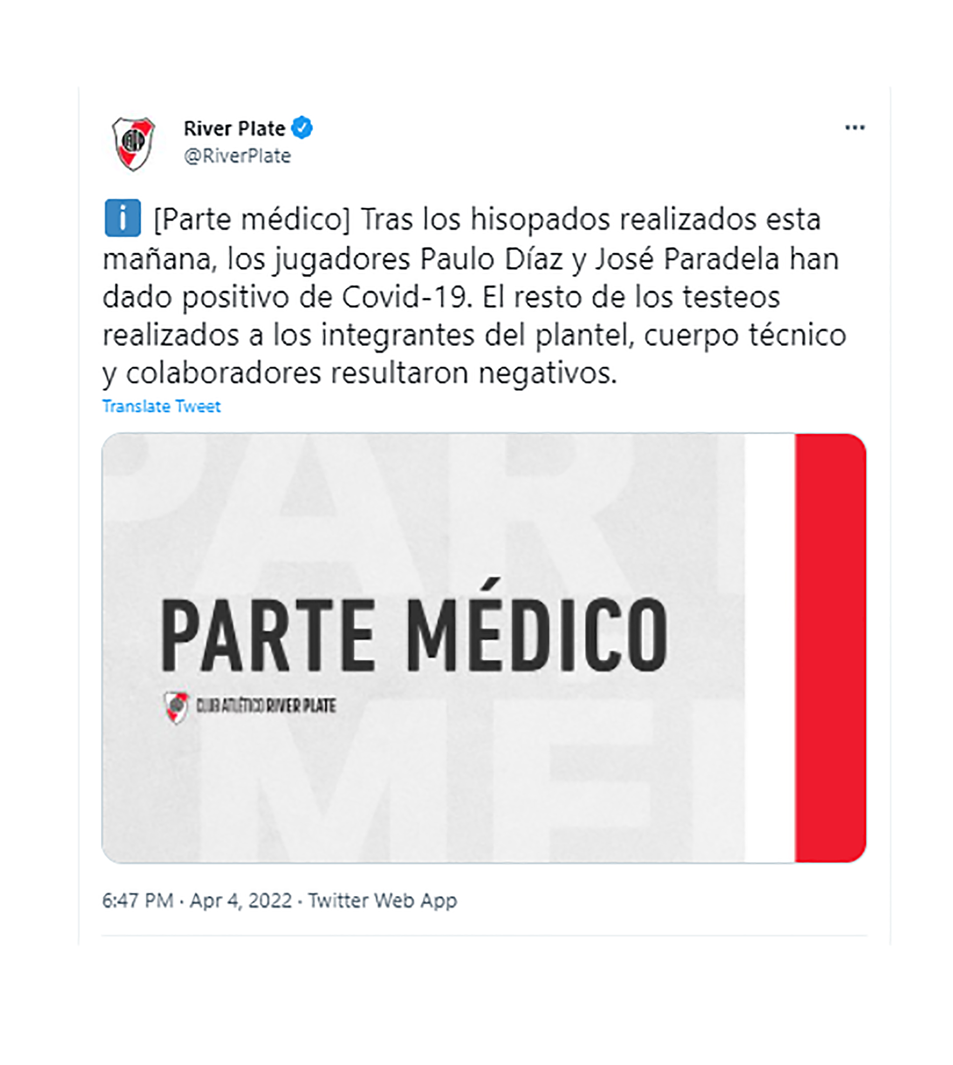 La novedad fue informada por las redes sociales del club de Núñez, en las que la institución indicó: “Tras los hisopados realizados esta mañana, los jugadores Paulo Díaz y José Paradela han dado positivo de COVID-19. El resto de los testeos realizados a los integrantes del plantel, cuerpo técnico y colaboradores resultaron negativos”.