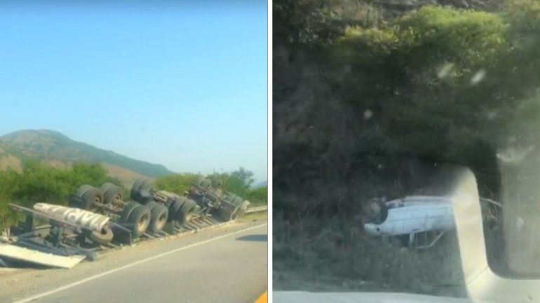El incidente sucedió hace poco más de una hora, por razones que se tratan de establecer un camión colisionó con auto y ambos terminaron volcando fuera de la ruta. Por el accidente hubo dos muertes.