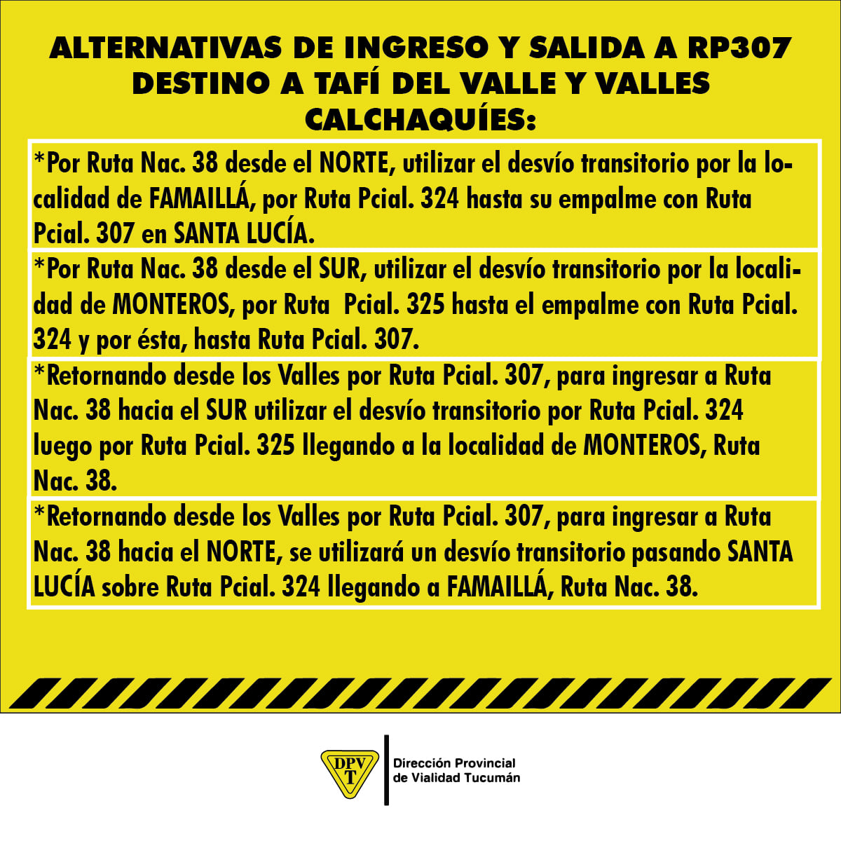 • Retornando desde los Valles por Ruta Provincial 307, para ingresar a Ruta Nacional 38 hacia el Norte, se utilizará un desvío transitorio pasando Santa Lucía sobre ruta Provincial 324, llegando a Famaillá por Ruta Nacional 38.