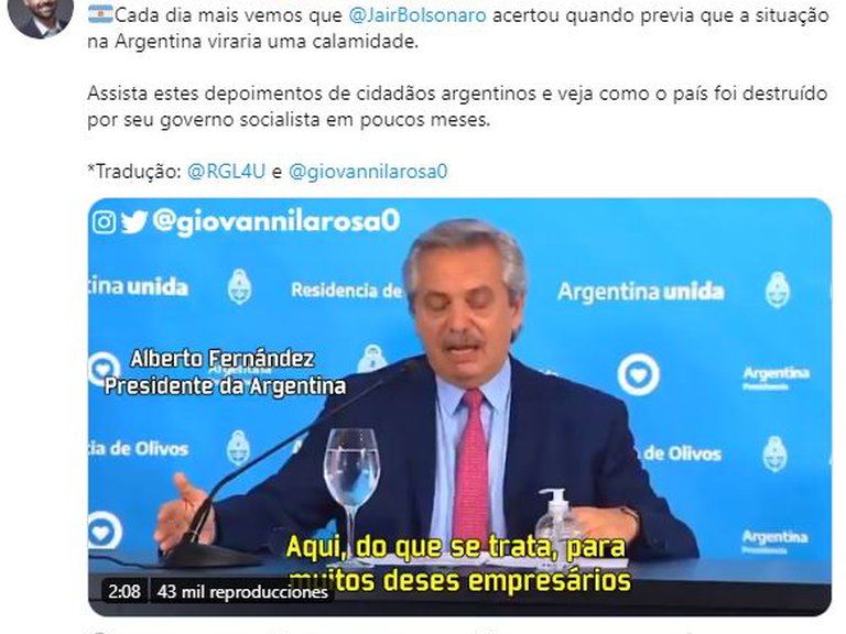 En una breve publicación que acompañó con un video editado con declaraciones de Alberto Fernández y de argentinos que perdieron sus empleos por la cuarentena, Eduardo Bolsonaro sostuvo: “Todos los días vemos que Jair Bolsonaro acertó cuando predijo que la situación en Argentina se convertiría en una calamidad”.