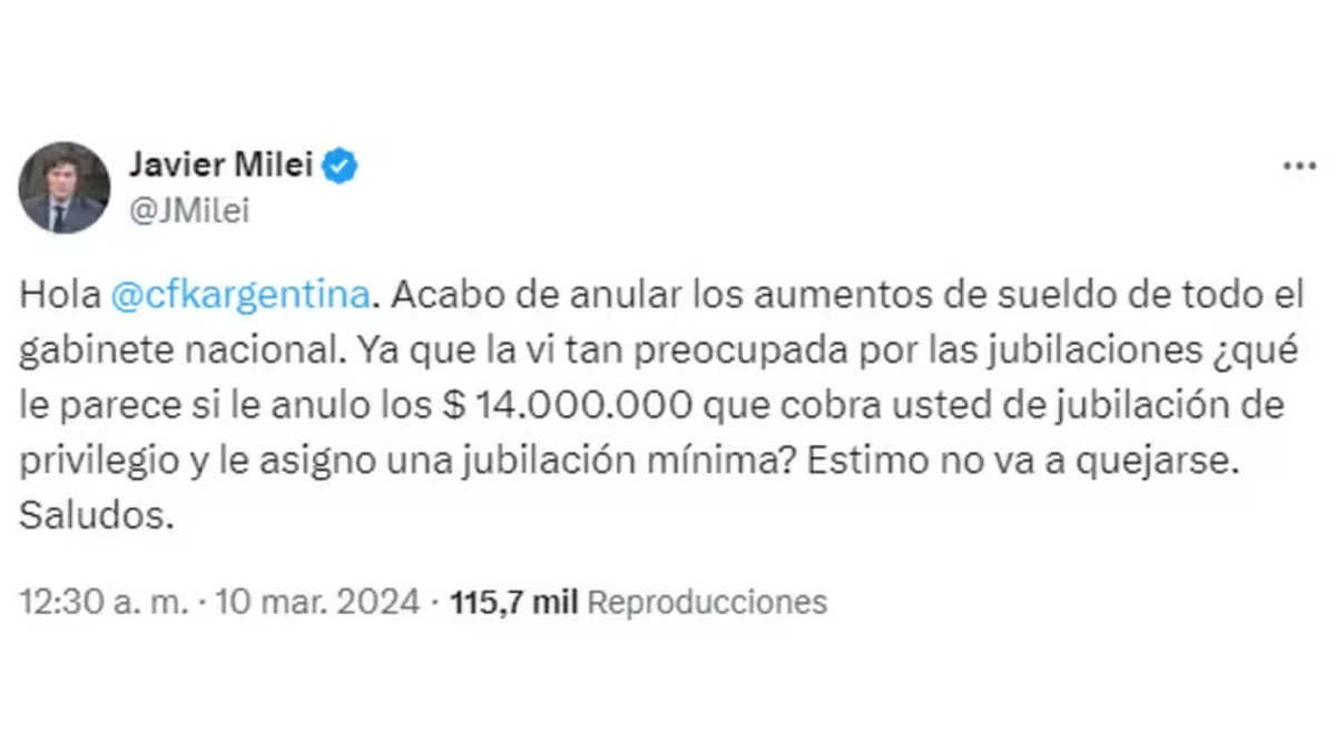 Luego que Milei culpara a la ex vicepresidenta por el aumento de sueldo para los cargos jerárquicos del Poder Ejecutivo, Cristina Kirchner respondió: “Lo hacía más valiente Presidente. Resulta que se descubre que usted y sus funcionarios se aumentaron el sueldo un 48% ¿y no se le ocurre mejor excusa que echarme la culpa a mí, por un decreto que firmé hace 14 años? Mejor ni le digo a quién me hace acordar, con esto de echarle la culpa a una mujer. Más casta y menos original no se consigue”.