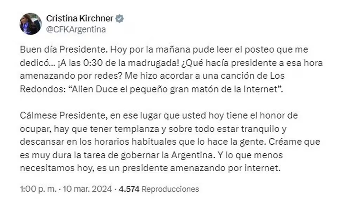 Lejos de bajarse de la disputa virtual, Cristina Kirchner le pidió al mandatario que se “calme”, le cuestionó el horario en el que le respondió y citó una canción del grupo Patricio Rey y sus Redonditos de Ricota. “Buen día Presidente. Hoy por la mañana pude leer el posteo que me dedicó… ¡A las 0:30 de la madrugada! ¿Qué hacía presidente a esa hora amenazando por redes? Me hizo acordar a una canción de Los Redondos: ‘Alien Duce el pequeño gran matón de la Internet’”.