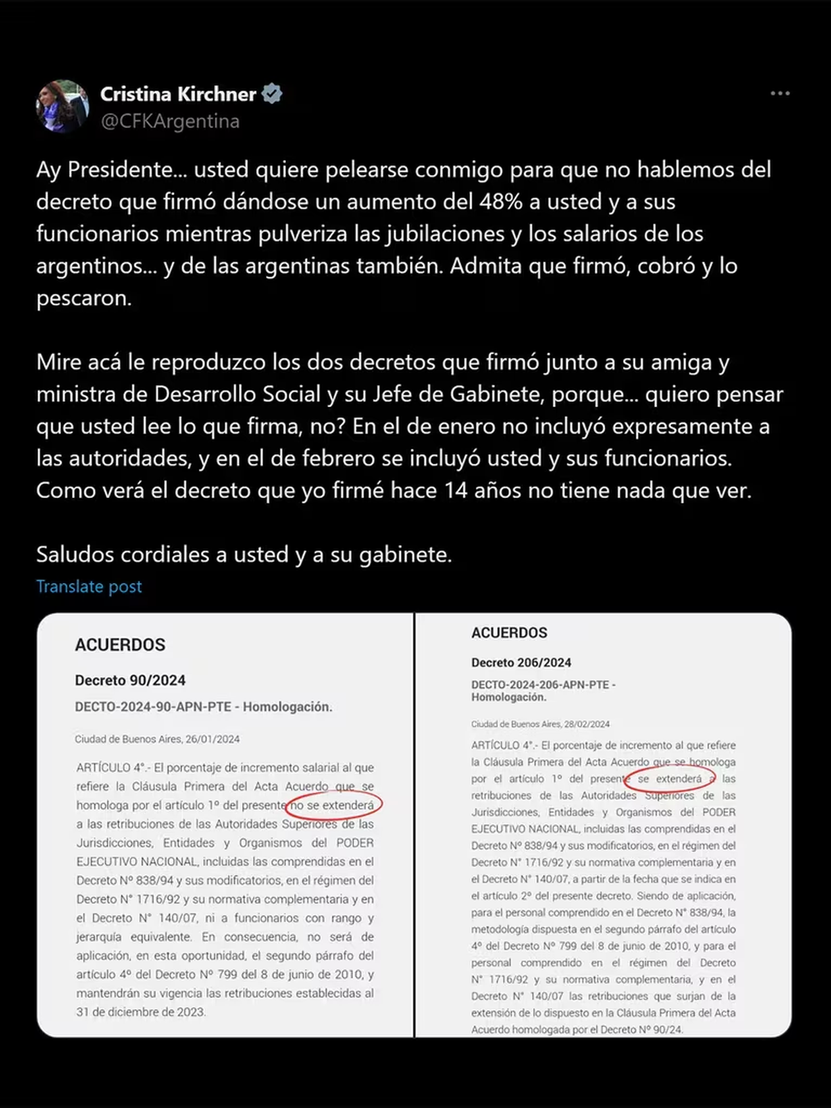 “Ay Presidente… usted quiere pelearse conmigo para que no hablemos del decreto que firmó dándose un aumento del 48% a usted y a sus funcionarios mientras pulveriza las jubilaciones y los salarios de los argentinos… y de las argentinas también. Admita que firmó, cobró y lo pescaron. Mire acá le reproduzco los dos decretos que firmó junto a su amiga y ministra de Desarrollo Social y su Jefe de Gabinete, porque… quiero pensar que usted lee lo que firma, no? En el de enero no incluyó expresamente a las autoridades, y en el de febrero se incluyó usted y sus funcionarios. Como verá el decreto que yo firmé hace 14 años no tiene nada que ver. Saludos cordiales a usted y a su gabinete”, replicó Fernández de Kirchner.