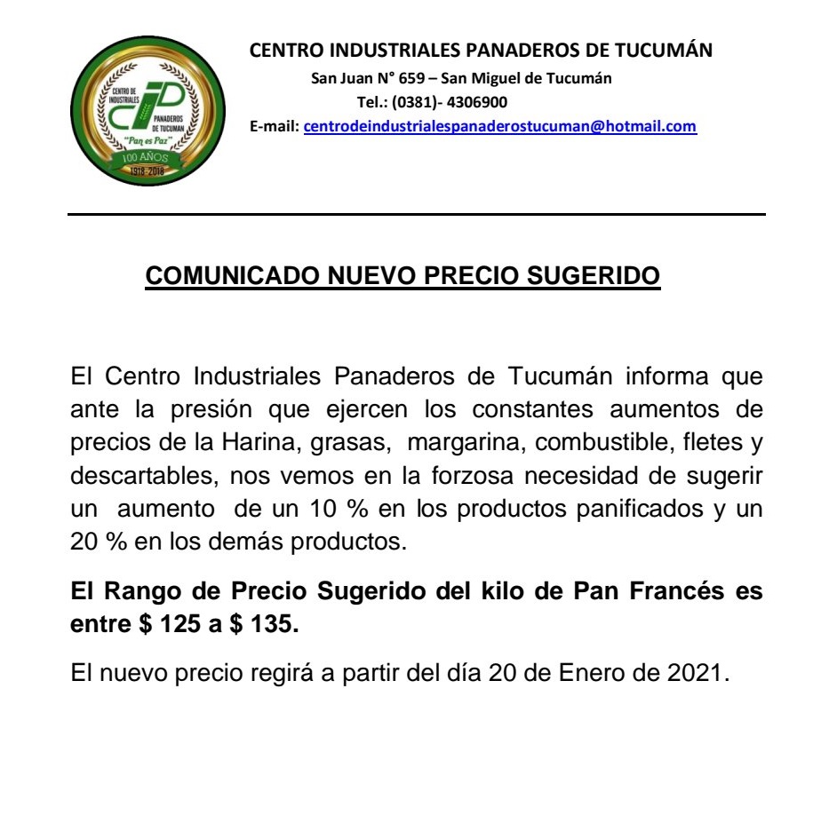 El Centro Industriales Panaderos de Tucumán sugiere un aumento del 10% en los productos panificados y un 20% en el resto de los productos a partir del miércoles 20 de enero. A través de un comunicado, informaron que el incremento responde a la “presión que ejercen los constantes aumentos de precios de la harina, grasas, margarina, combustibles, fletes y descartables”. De este modo, el rango de precio sugerido del kilo de pan francés con este nuevo aumento sería entre $125 a $135. Al respecto, Pablo Albertus, titular del organismo expuso que “Hay un conflicto con el trigo a pesar de haber sido una buena cosecha para el campo. Las molinerías no han podido reponer los stocks que ellos vienen sosteniendo todos los años. Eso ha hecho que el precio se dispare”, explicó en una entrevista radial con Lv12.  Albertus contó que hace dos semanas la bolsa de harina la pagaban hasta $1500 pesos, ahora se ubica en $1700 y hay una proyección de que alcance los $2000 en el corto tiempo.