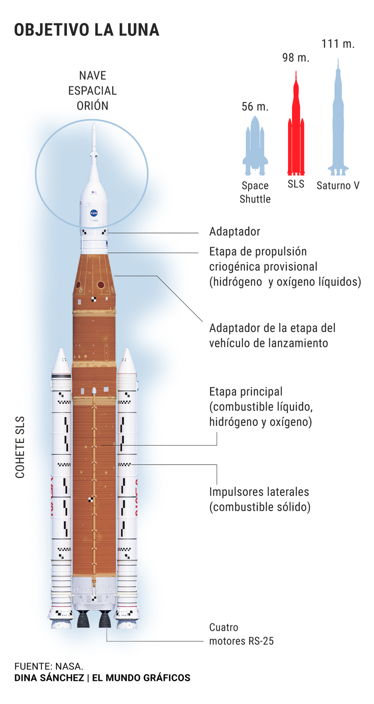 La meta de Artemis 1, nombrado así por la hermana gemela de Apollo, probará el cohete de 98 metros con el Sistema de Lanzamiento Espacial y la cápsula Orion, adaptada para tripulación, en su parte más alta.