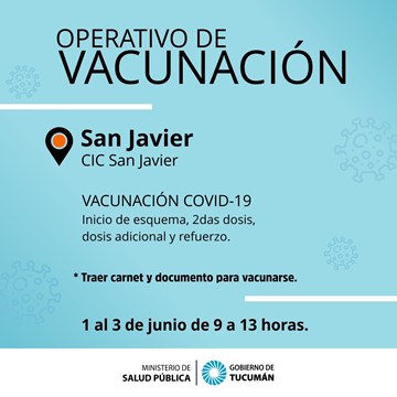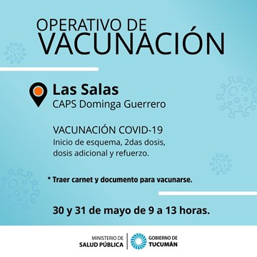 El 30 y 31 de mayo, el operativo de inmunización móvil se apostará en Las Salas; y el 1, 2 y 3 de Junio en San Javier, con el objetivo de brindar a la comunidad de estas zonas la posibilidad de iniciar esquemas, colocarse segundas dosis, adicionales y refuerzo.