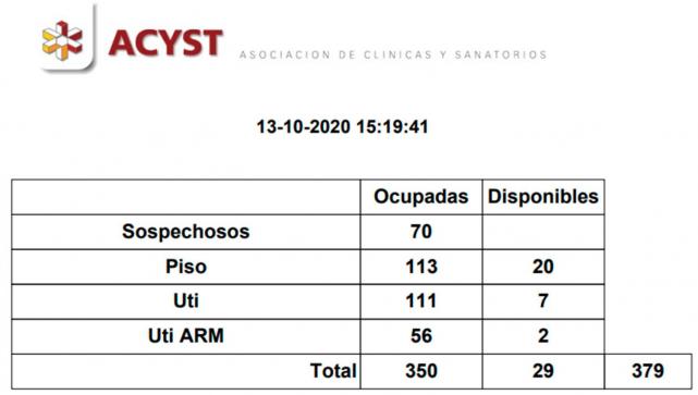 El detalle precisa que hay 350 camas ocupadas en los sanatorios para pacientes con covonavirus: 70 para casos sospechosos, 113 de piso, 111 en terapia intensiva y 56 en terapia y con asistencia mecánica respiratoria.