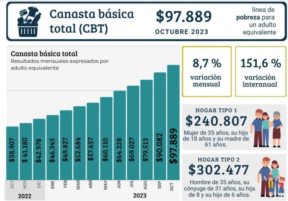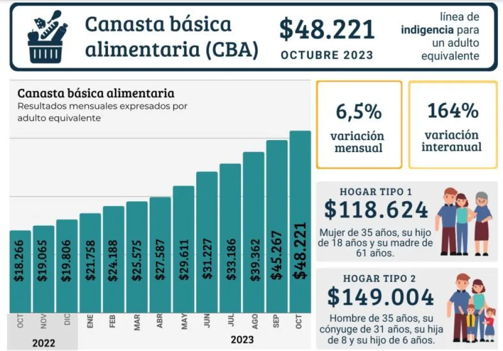 La variación mensual de la canasta básica alimentaria (CBA) con respecto al mes de septiembre de 2023 fue de 6,5% en Tucumán, mientras que la variación de la canasta básica total (CBT) fue de 8,7%.