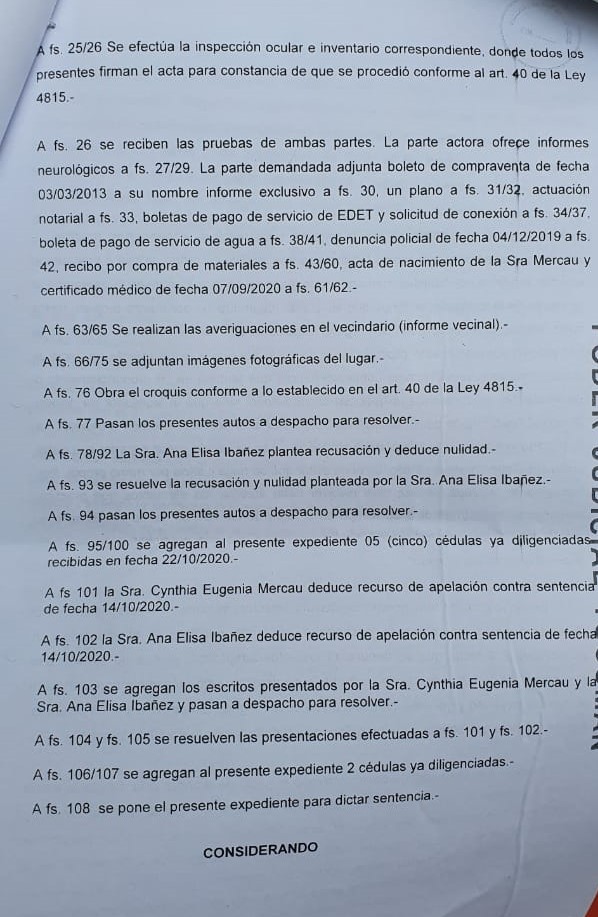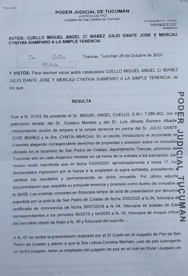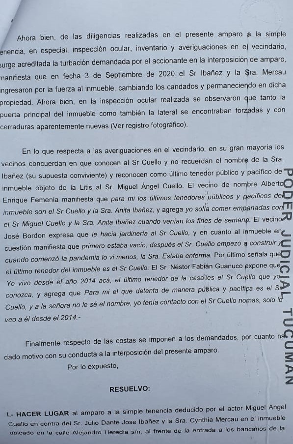 En esta dirección, relató que salió una sentencia condenatoria y se hizo lugar al amparo a la simple tenencia, con lo cual, se le dio un plazo de 10 días al juez y su sobrina para que desalojen el inmueble. “Se realizó la audiencia y las impacciones oculares correspondientes, y se constató lo que ocurrió que ese día 3 de septiembre. Quedó fehacientemente constatada la situación ilegal. Todos los vecinos coincidieron que el único poseedor público, pacífico e interrumpido de ese inmueble es Miguel Ángel Cuello”, concluyó el letrado.
