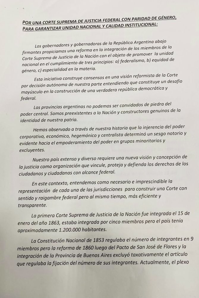 Los gobernadores y gobernadoras de la República Argentina abajo firmantes propiciamos una reforma en la integración de los miembros de la Corte Suprema de Justicia de la Nación con el objeto de promover la unidad nacional en el cumplimiento de tres principios: a) federalismo, b) equidad de género, c) especialidad en la materia.