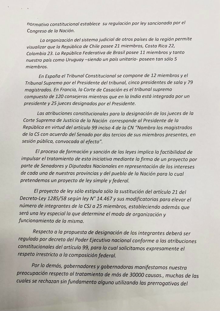 “Las provincias argentinas no podemos ser convidados de piedra del poder central. Somos preexistentes a la Nación y constructores genuinos de la identidad de nuestra patria“, manifestaron los gobernadores, y subrayaron que “Nuestro país extenso y diverso requiere una nueva visión y concepción de la justicia como organización que vincule, proteja y defienda los derechos de los ciudadanos y ciudadanas con alcance federal”.
