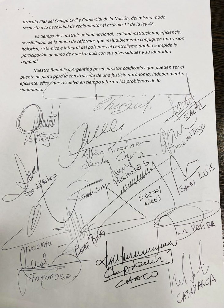 Tras la reunión del presidente Alberto Fernández con los gobernadores y gobernadoras del Frente de Todos la tarde del jueves, el viernes por la noche se difundió a través de las redes sociales el documento que lleva la firma de 16 mandatarios para impulsar la reforma de la Corte “con el objeto de promover la unidad nacional en el cumplimiento de tres principios: a) federalismo, b) equidad de género, c) especialidad en la materia“.