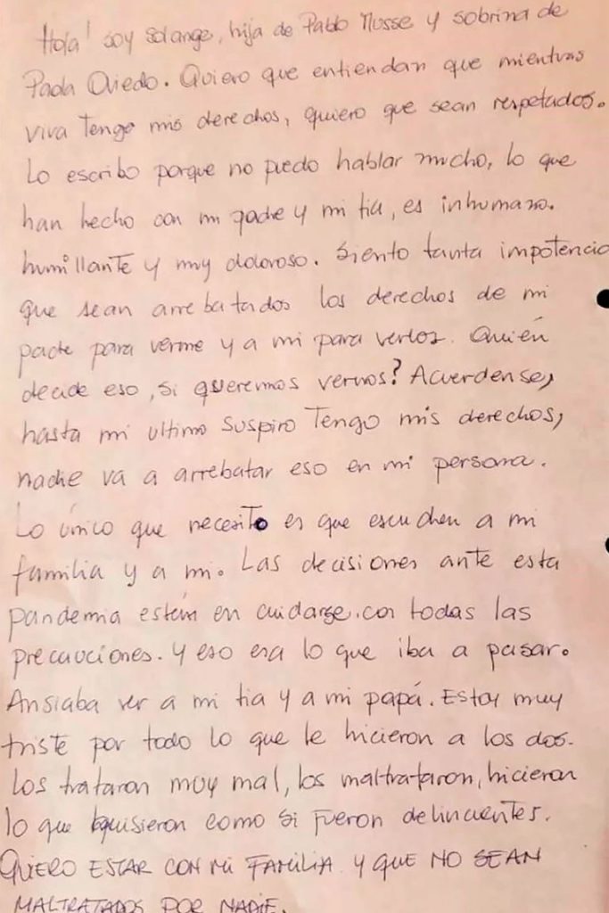 “Hasta en mi último suspiro tengo derechos”, escribió la joven antes de morir, en una carta en la que vuelca toda su indignación y tristeza por la forma en que le negaron no sólo un derecho sino también un último deseo. “Siento tanta impotencia de que sean arrebatados los derechos de mi padre para verme y a mí para verlo. ¿Quién decide eso si queremos vernos? Acuérdense, hasta mi último suspiro tengo mis derechos, nadie va a arrebatar eso en mi persona”, escribió la joven.