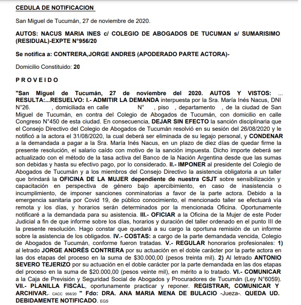 La jueza Ana María Mena de Bulacio sentenció al Consejo Directivo del Colegio de Abogados de Tucumán a realizar de manera obligatoria un curso de Género, debido a una sanción disciplinaria que la institución tomó contra una trabajadora que había denunciado acoso sexual.