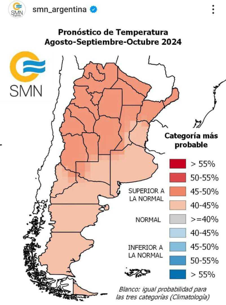 El Servicio Meteorológico Nacional (SMN) ha emitido una alerta sobre posibles condiciones climáticas extremas en Argentina. Se espera que las lluvias estén entre un 40% y 50% por debajo de lo normal, con temperaturas que podrían aumentar hasta un 50% más de lo habitual, especialmente en septiembre y octubre.