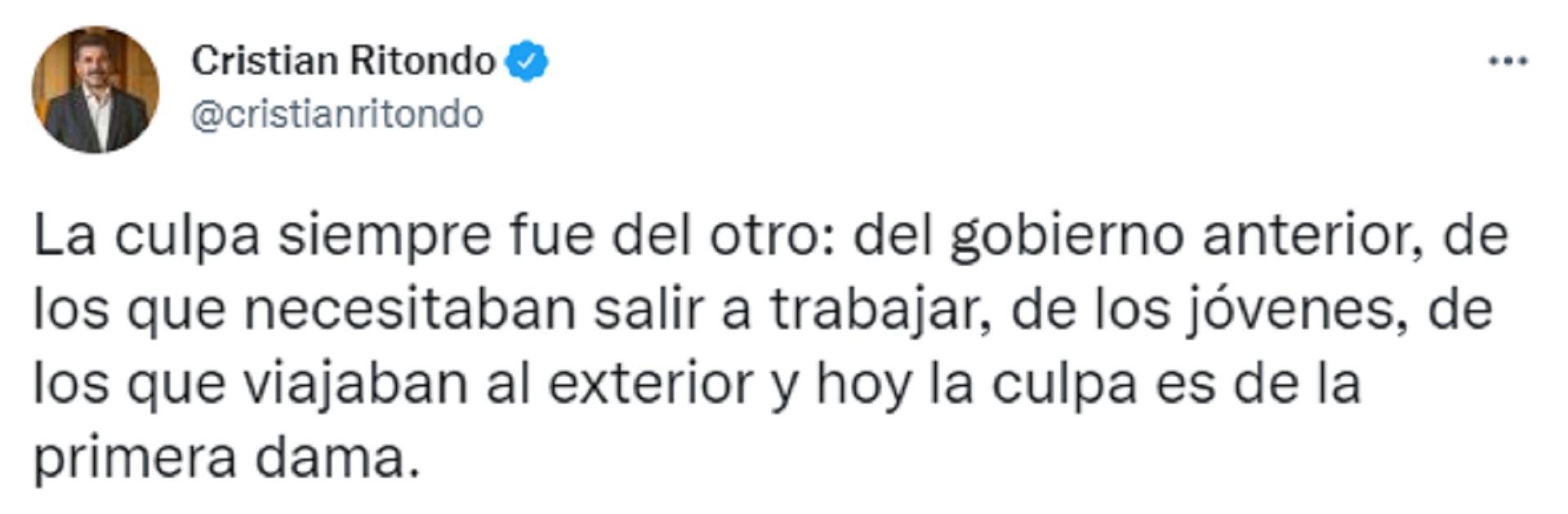 El presidente del bloque de diputados del PRO, Cristian Ritondo, afirmó que para el oficialismo “la culpa siempre fue del otro: del gobierno anterior, de los que necesitaban salir a trabajar, de los jóvenes, de los que viajaban al exterior y hoy la culpa es de la primera dama”.