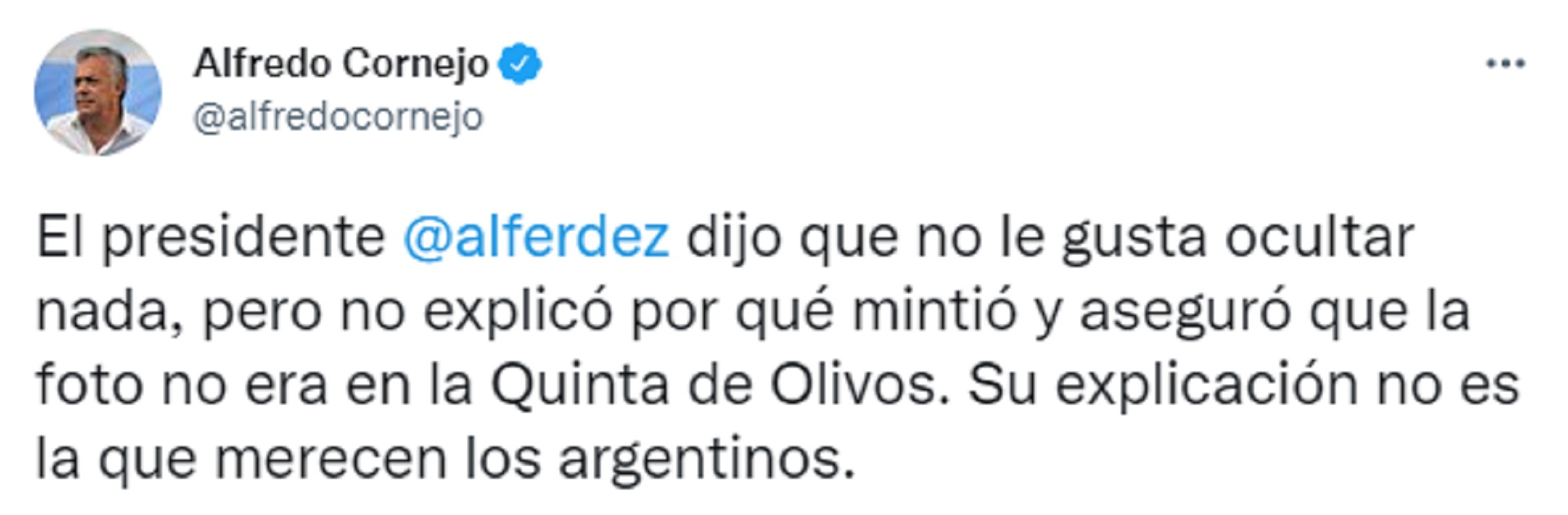 En la misma línea, el titular de la UCR, Alfredo Cornejo, señaló que a pesar de que el Presidente dijo que no le gusta ocultar nada, “no explicó por qué mintió y aseguró que la foto no era en la Quinta de Olivos”. “Su explicación no es la que merecen los argentinos”, continuó.