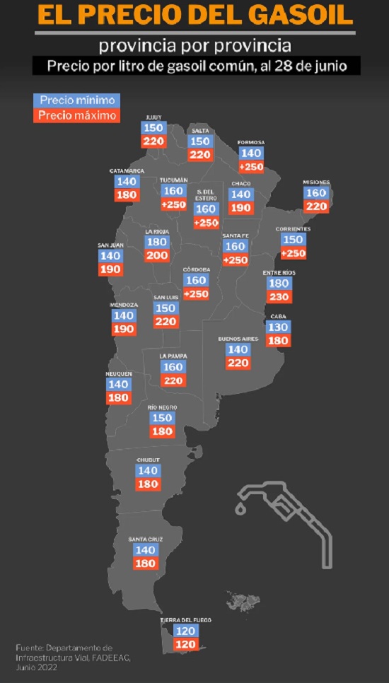 Tras una encuesta con las 44 Cámaras de transporte que agrupa FADEEAC, se observa que varios distritos en los que los conductores y propietarios de camiones pagaron más de $250 por litro, mientras que en otras las cifras máximas informadas rondan los $180.