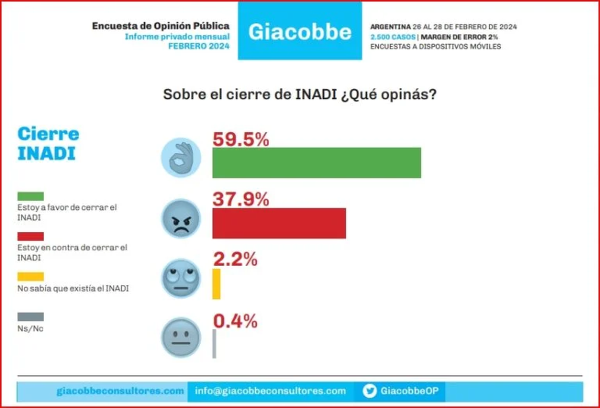 La consultora Giaccobe lanzó un informe en donde revela cómo reaccionó la sociedad argentina el cierre del instituto. El relevamiento indica que el 59,5% de los encuestados están de acuerdo con el cierre del Inadi. Al mismo tiempo, quienes no están a favor del mismo son el 37,9% de los argentinos encuestados.