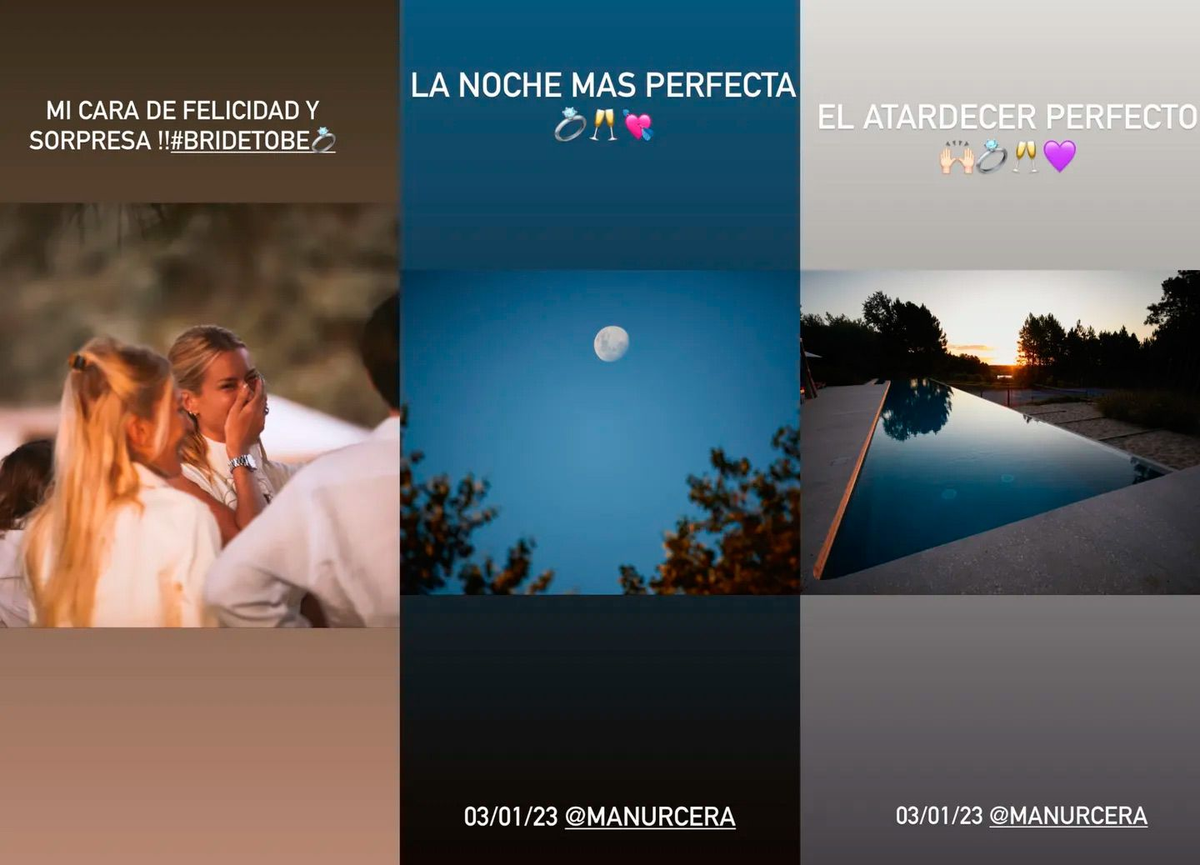 El corredor de autos le hizo la propuesta a la modelo de manera sorpresiva en la cena de aniversario de sus padres. “Ayer venía convencida de que iba a la comida aniversario de mis suegros (post 00). Ni enterada de lo que me esperaba”, escribió la modelo en sus Historias de Instagram. También mostró una foto de su cara de sorpresa al escuchar la gran pregunta por parte de su novio. Y, contó que para ese momento, el corredor de autos eligió que leyeran una carta de Frida Kalho, que es una de sus artistas preferidas.