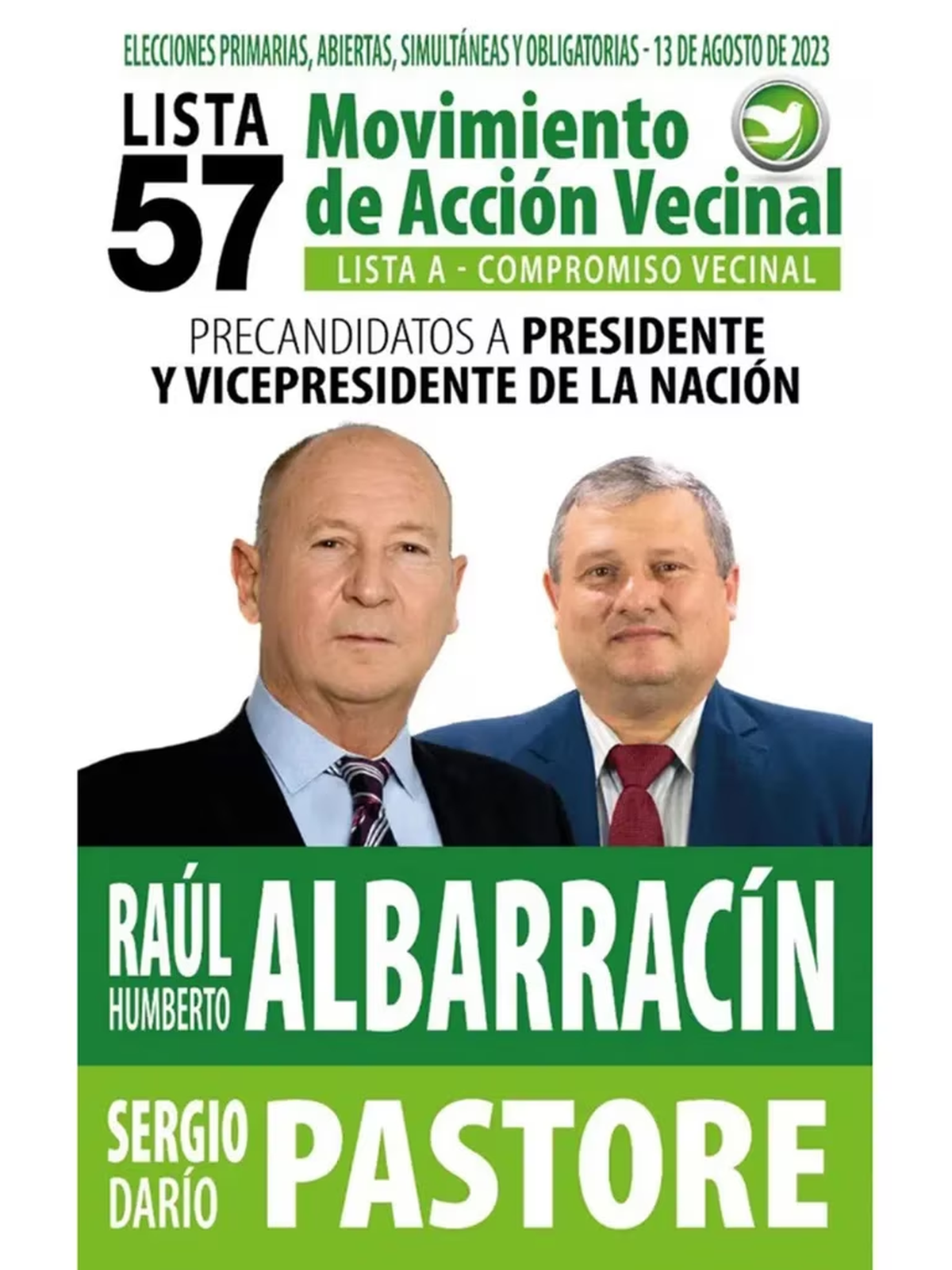 La boleta del espacio Movimiento de Acción Vecinal presenta como precandidato a presidente a Raúl Humberto Albarracín y lleva como vicepresidente a Sergio Pastore, ambos compiten dentro de la lista 57. De perfil opositor y antikirchnerista, Albarracín fue legislador por la Provincia de Córdoba.