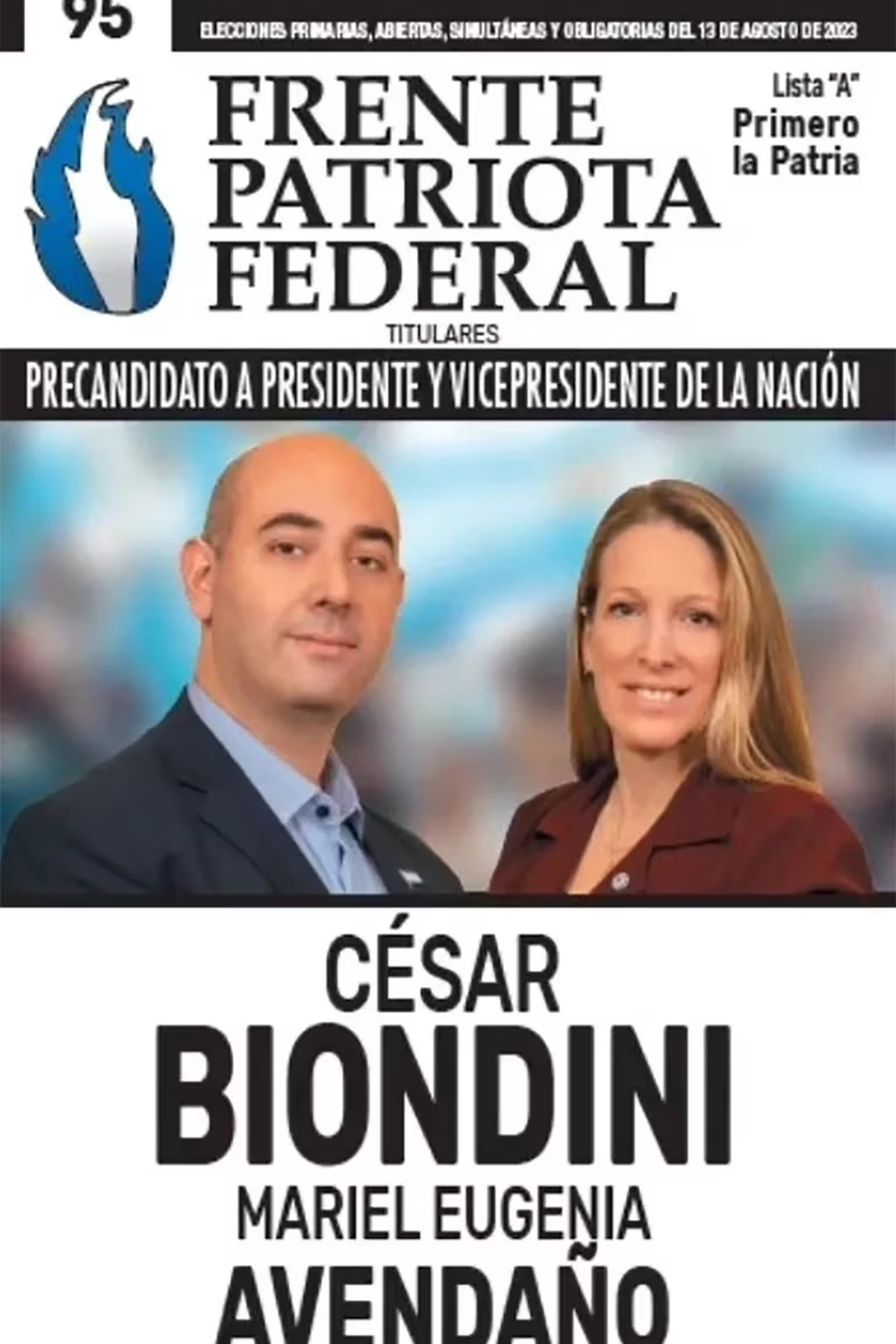El Frente Patriota Federal (FPF) inscribió a César Biondini -un abogado de 40 años de una agrupación ligada a la ultraderecha- como precandidato a presidente y a la economista Mariel Avendaño para la vicepresidencia.