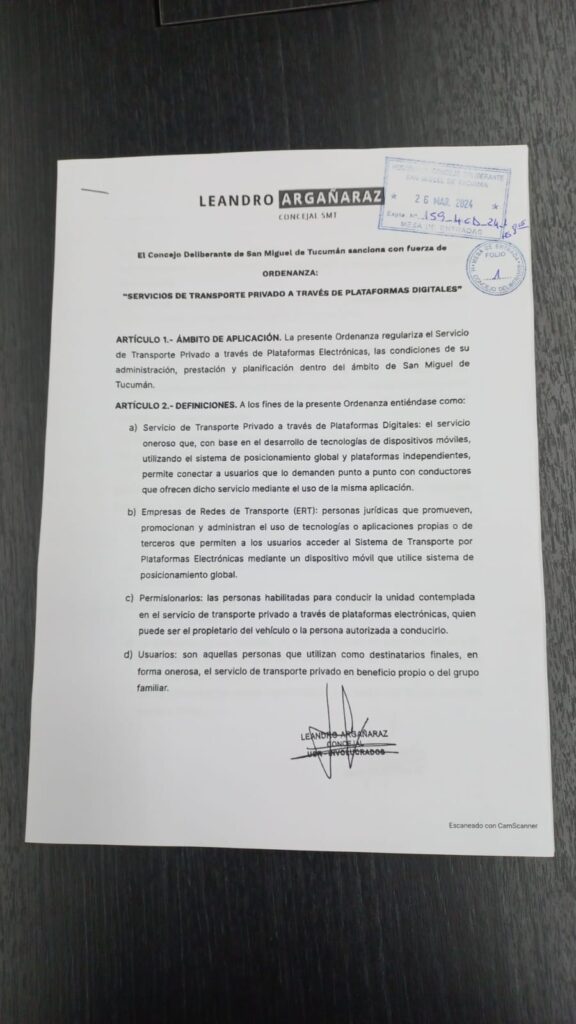 El concejal de la capital tucumana, Leandro Argañaraz (UCR), presentó un proyecto para regularizar el servicio de transporte privado a través de plataformas digitales.