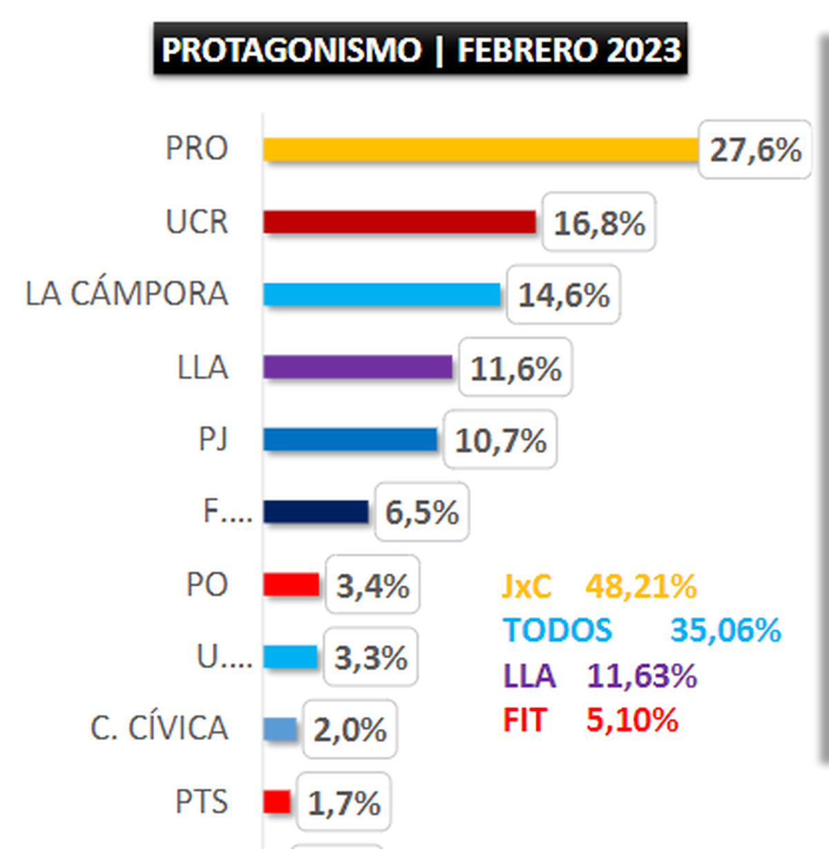 En el informe se detalla que durante febrero, ambos socios en Juntos por el Cambio se quedaron con el 48,2% de las menciones en Twitter y búsquedas en Google. Es decir, el principal frente opositor dominó con bastante claridad tanto la participación política activa y pasiva de los usuarios geolocalizados en la Argentina. “El Pro fue el partido que más aporto a JxC, al sumar el 27,6% del protagonismo. Los radicales sumaron el 16,8%, la Coalición Cívica el 2%, los republicanos de Ricardo López Murphy el 1,2% y el Partido Socialista el 0,6%.En segundo lugar, se ubicó el Frente de Todos con el 35% del protagonismo total durante febrero. El aporte mayoritario al frente oficialista lo hizo La Cámpora con el 14,6% del protagonismo en redes y la Web”.