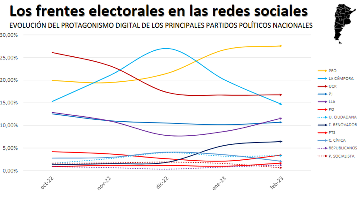 La consultora Scidata realizó un análisis de la evolución del protagonismo digital de los principales partidos políticos de cara a las elecciones 2023.