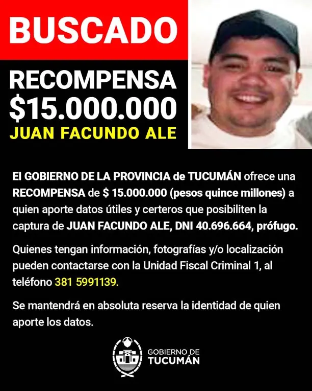 El gobierno provincial ofrece una recompensa de 15 millones de pesos por información que permita capturar a Facundo Ale, el único prófugo que queda tras el tiroteo ocurrido el 21 de septiembre durante una fiesta electrónica en Tafí Viejo.