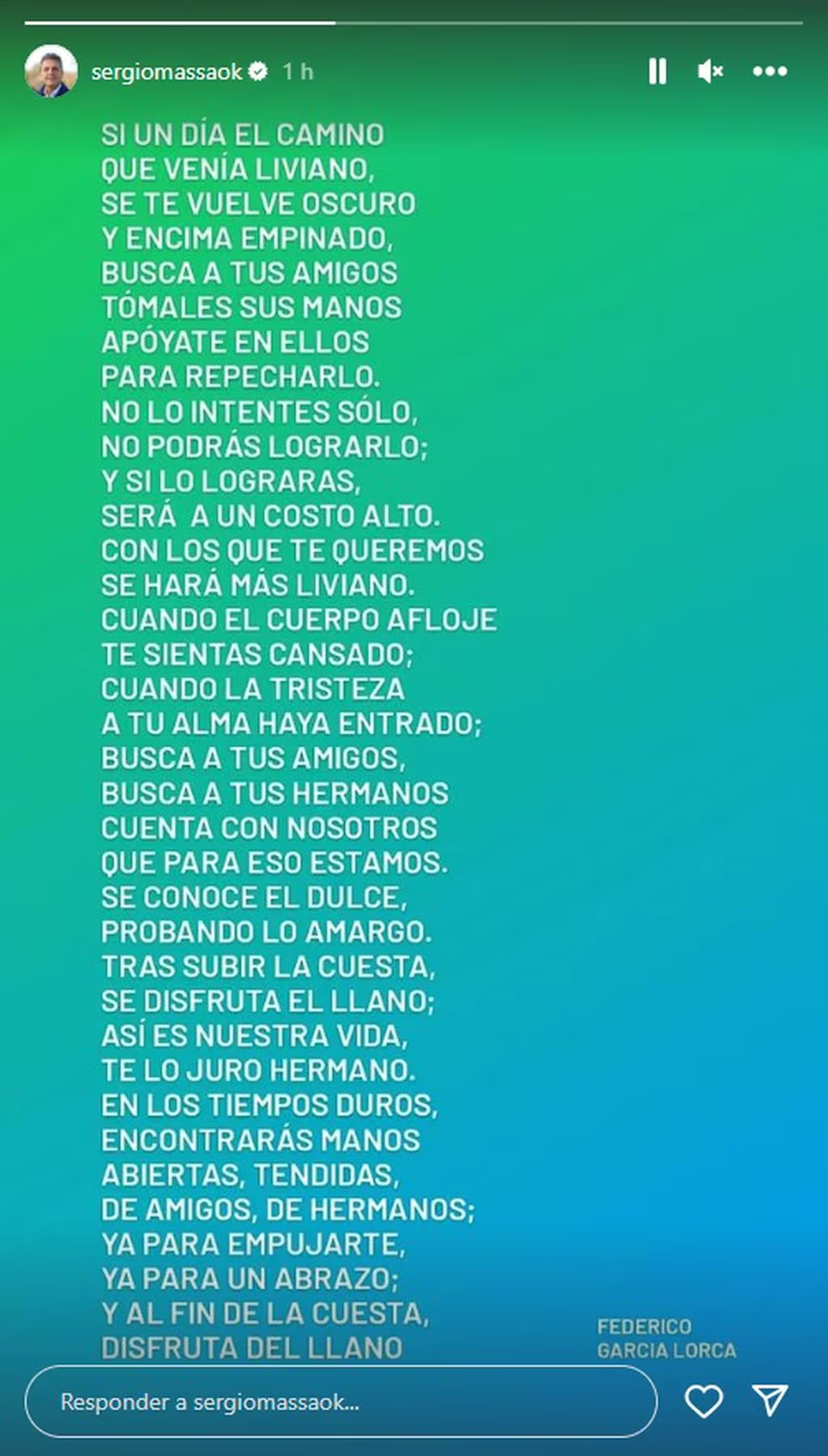 Ahora, en Instagram, Massa posteó una historia con un escrito que él adjudicó a García Lorca pero que en verdad le pertenece a Federico García Hamilton, un ingeniero aficionado a la poesía nacido en Tucumán. El poema se llama “La cuesta de la vida” y fue publicado en 2018.