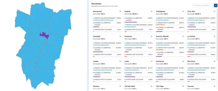 El predominio de Tucumán Primero fue contundente en el resto del mapa. En Burruyacú alcanzó el 72,86%; en Chicligasta, 44,84% (aunque aquí Unidos por Tucumán fue segundo con 30,27%); en Cruz Alta, 60,97%; en Famaillá, 55,85%; y en Graneros, un aplastante 75,07%. La tendencia se repitió en Juan Bautista Alberdi (48,27%, con Unidos por Tucumán segundo con 25,97%); La Cocha (63,53%); Leales (68,20%); y Lules (51,47%).