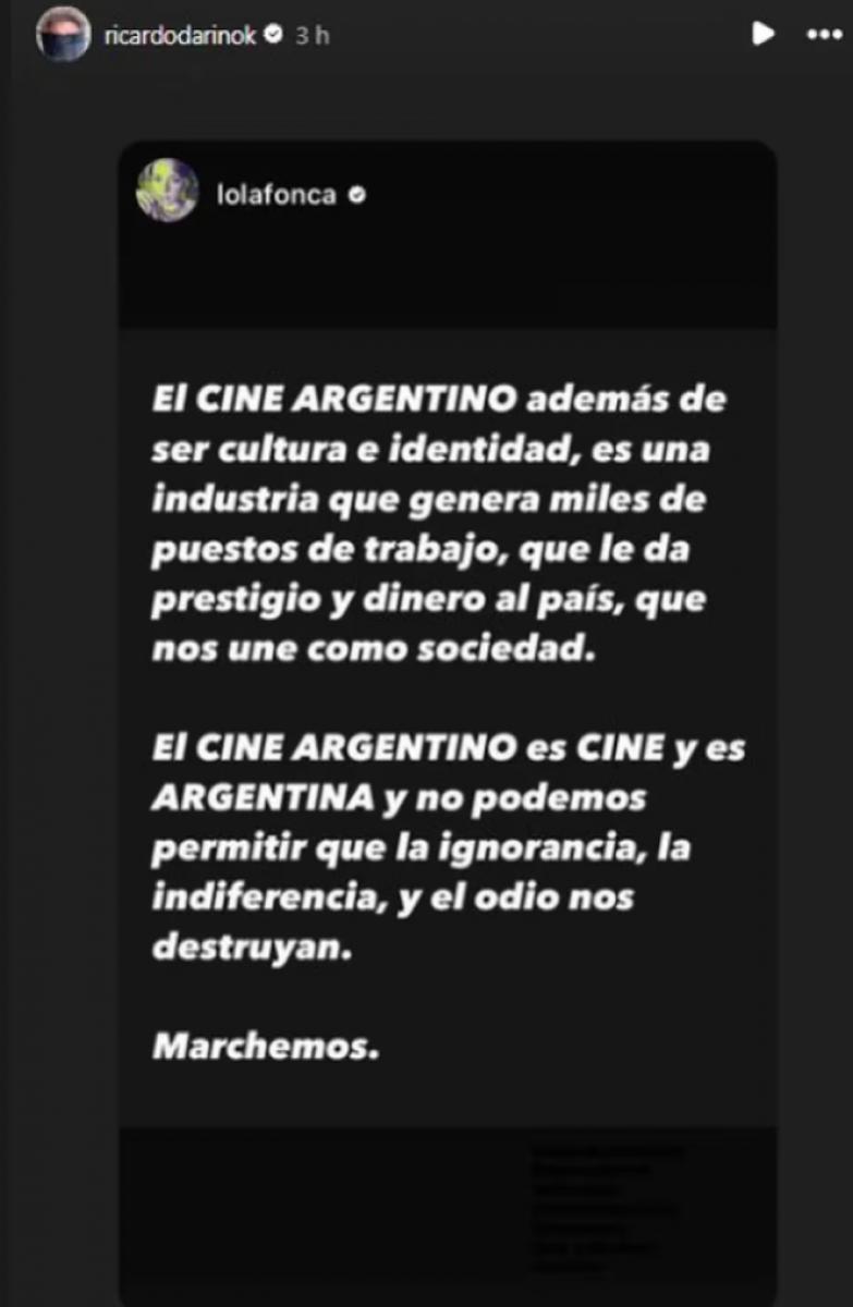 Luego, continuó: “Que le da prestigio y dinero al país, que nos une como sociedad. El cine argentino es cine y es Argentina y no podemos permitir que la ignorancia, la indiferencia y el odio nos destruyan. Marchemos”, concluyó en su mensaje, que fue replicado también por otras celebridades, como Julieta Zylberberg, Mercedes Morán