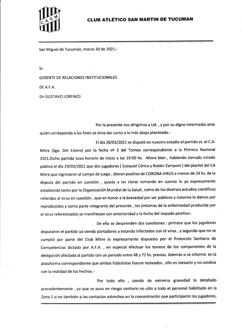 Ante la situación, San Martín realizó un reclamo formal ante la AFA aduciendo que “los jugadores jugaron el partido ya portando el virus” y “que no se cumplió por parte de Mitre lo expresamente dispuesto el Protocolo Sanitario de Competencias de AFA, en especial efectuar los testeos de los componentes de la delegación afectada al partido con un periodo entre 48 y 72 hs previas. Además, si se informó que en la plataforma correspondiente que ambos futbolistas fueron testeados, ello es inexacto y no condice con la realidad de los hechos”.