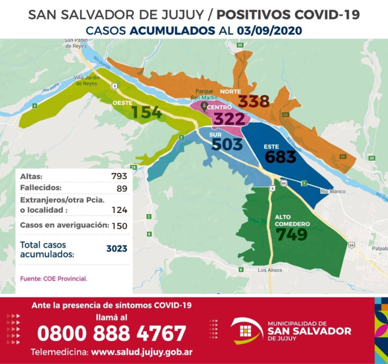 El COE municipal de San Salvador de Jujuy, presentó un informe detallando las zonas más afectadas por el coronavirus, junto a un mapa de georeferenciación. En San Salvador de Jujuy, ya se registran desde el inicio de la pandemia, 3.023 casos de Covid – 19, siendo Alto Comedero la zona más afectada con 749 casos.